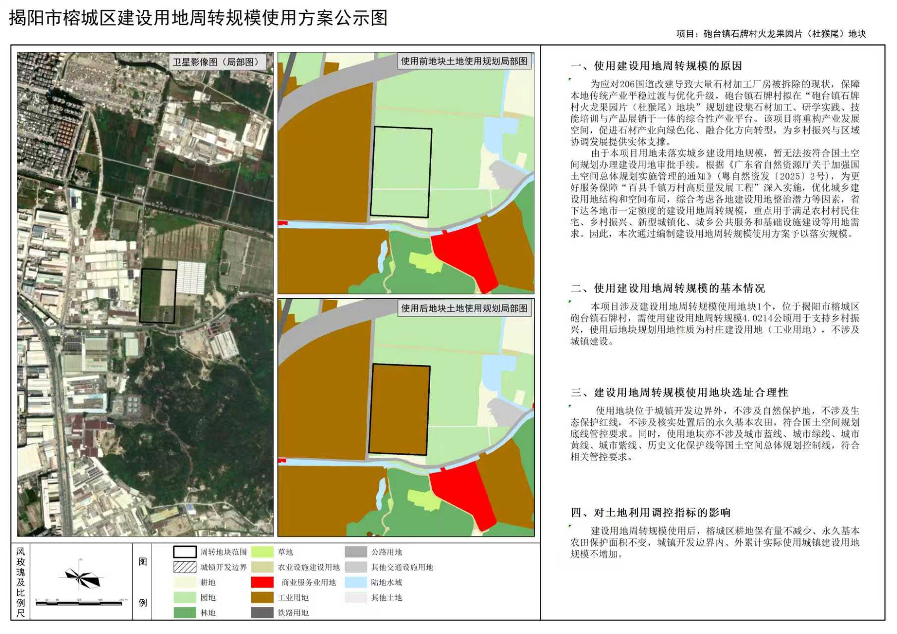 为深入贯彻实施“百千万工程”战略部署,推动一二三产业融合,为砲台镇石牌村火龙果园片(杜猴尾)地块建设石材加工项目做好空间保障,我局组织编制了《揭阳市榕城区建设用地周转规模使用方案(砲台镇石牌村火龙果园片(杜猴尾)地块)》(以下简称《方案》),拟为项目用地落实建设用地周转规模4.0214公顷。现对《方案》主要内容进行公示,广泛征求社会公众及相关权利人意见。