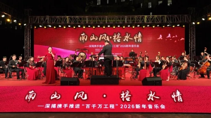 12月28日晚,市区东风体育广场乐声飞扬。“南山风·榕水情——深揭携手推进“百千万工程”2026新年音乐会”在此举行。近千名来自深圳南山和揭阳榕城两地的各界代表齐聚一堂,其中包括榕城区市级以上道德模范、劳动模范、文明(最美)家庭代表以及省级以上非遗传承人等。大家在激昂的民族管弦乐中,共同回顾携手同行的坚实足迹,展望协同发展的崭新蓝图。