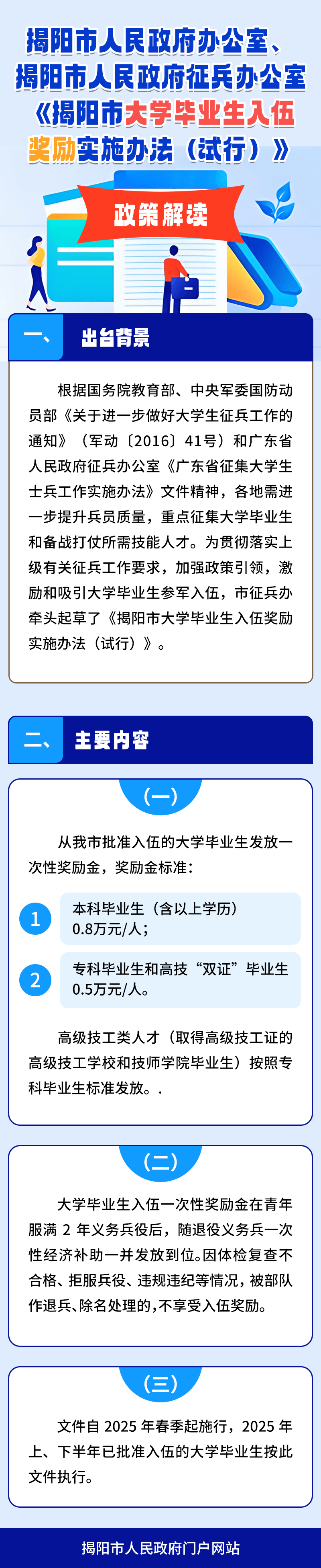 一图读懂:揭阳市人民政府办公室、揭阳市人民政府征兵办公室《揭阳市大学毕业生入伍奖励实施办法(试行)》政策解读