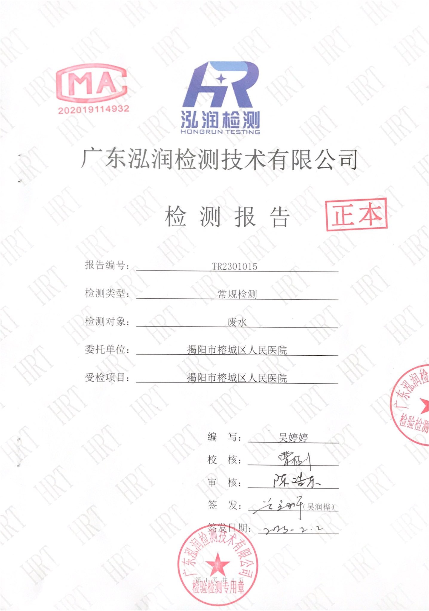 揭阳市榕城区人民医院2023年1月污水检测报告
